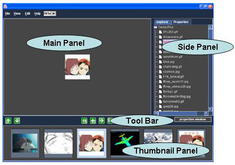 Navigating and display are made to be one of the easiest things to learn in picture book. There are many ways to navigate through the collections including using the tool bar, the side panel and the thumbnail panel. The image that is displayed in the main panel is called the current image. In the thumbnail panel the thumbnail view of the current image is highlighted with light blue. (